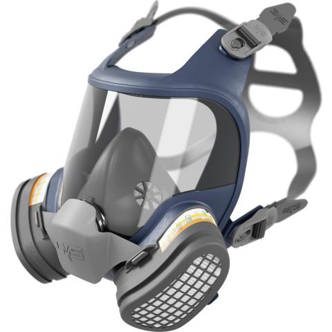 Kevyt kokokasvomallinen hengityksensuojain tiiviillä silmiensuojaimella ja vaihdettavalla ABE1P3 R D yhdistelmäsuodatinparilla: Hiukkassuodatus ja kaasusuodatus. Poikkeuksellisen leveä näkökenttä.