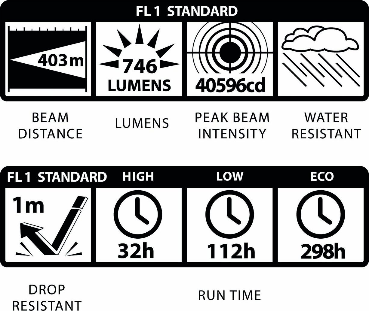 Suorituskyky ANSI FL1 standardin mukaisesti: Valon kantama 403 m, valovirta 746 lumenia, valon voimakkuus 40 596 candelaa. Paloaika Full Power asetuksella 32 h, Low Power asetuksella 112 h ja Eco asetuksella 298 h (joiden jälkeen on vielä 10 % alkuperäisestä valon voimakkuudesta jäljellä. Käytännössä valaisin palaa yhtäjaksoisesti yötä päivää n. pari viikkoa käyttökelpoisella valokeilalla, kunnes paristojen jännite on 0,99V ollen kokoluokkansa energiatehokkain valaisin markkinoilla!). Roiskevesitiivis IPX4. Iskunkestävä 1 m.