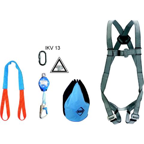 Perus putoamissuojainpakkaus työskentelyyn putoamisvaarallisissa olosuhteissa, esim. nostokorissa: Putoamisen pysäyttävät kokovaljaat, sisäänkelautuva 2m turvatarrain integroidulla nykäyksenvaimentimella, lukkosulkurengas, ankkurinauhalenkki suojuksella ja varastointi/kuljetussäkki.