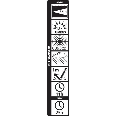 Suorituskyky ANSI FL1 standardin mukaisesti: Valon kantama 156 m, valovirta 127 lumenia, valon voimakkuus 6093 candelaa. Paloaika High asetuksella 11 h ja Low asetuksella 25 h (joiden jälkeen on vielä 10% alkuperäisestä voimakkuudesta jäljellä). Roiskevesitiivis, iskunkestävä 1 m.