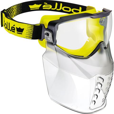 Matalaprofiilinen kasvojensuojain Bollé Safety Spectrum-suojamaskeille. Liitetään suojamaskin alakehykseen helposti ja nopeasti napsauttamalla..