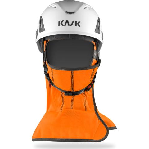 Kylmiin työolosuhteisiin suunniteltu päätä ja korvia lämmittävä korkealuokkainen kypärähuppu kaikkien työ- ja pelastuskypärien kanssa käytettäväksi.