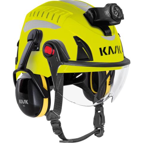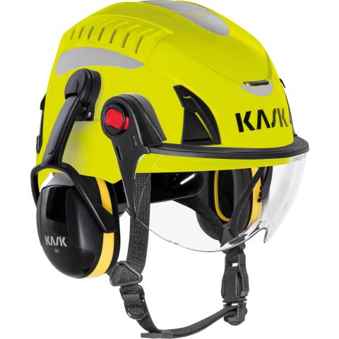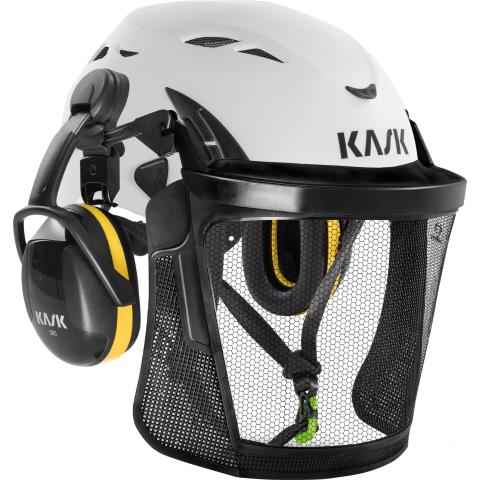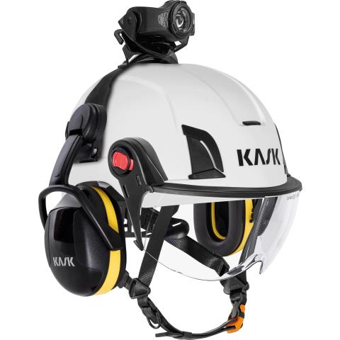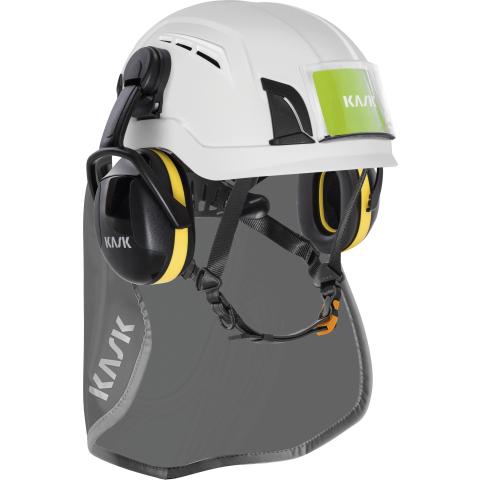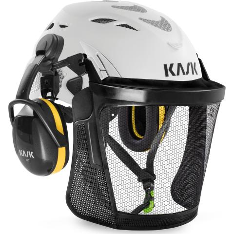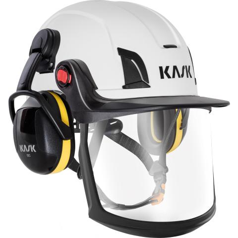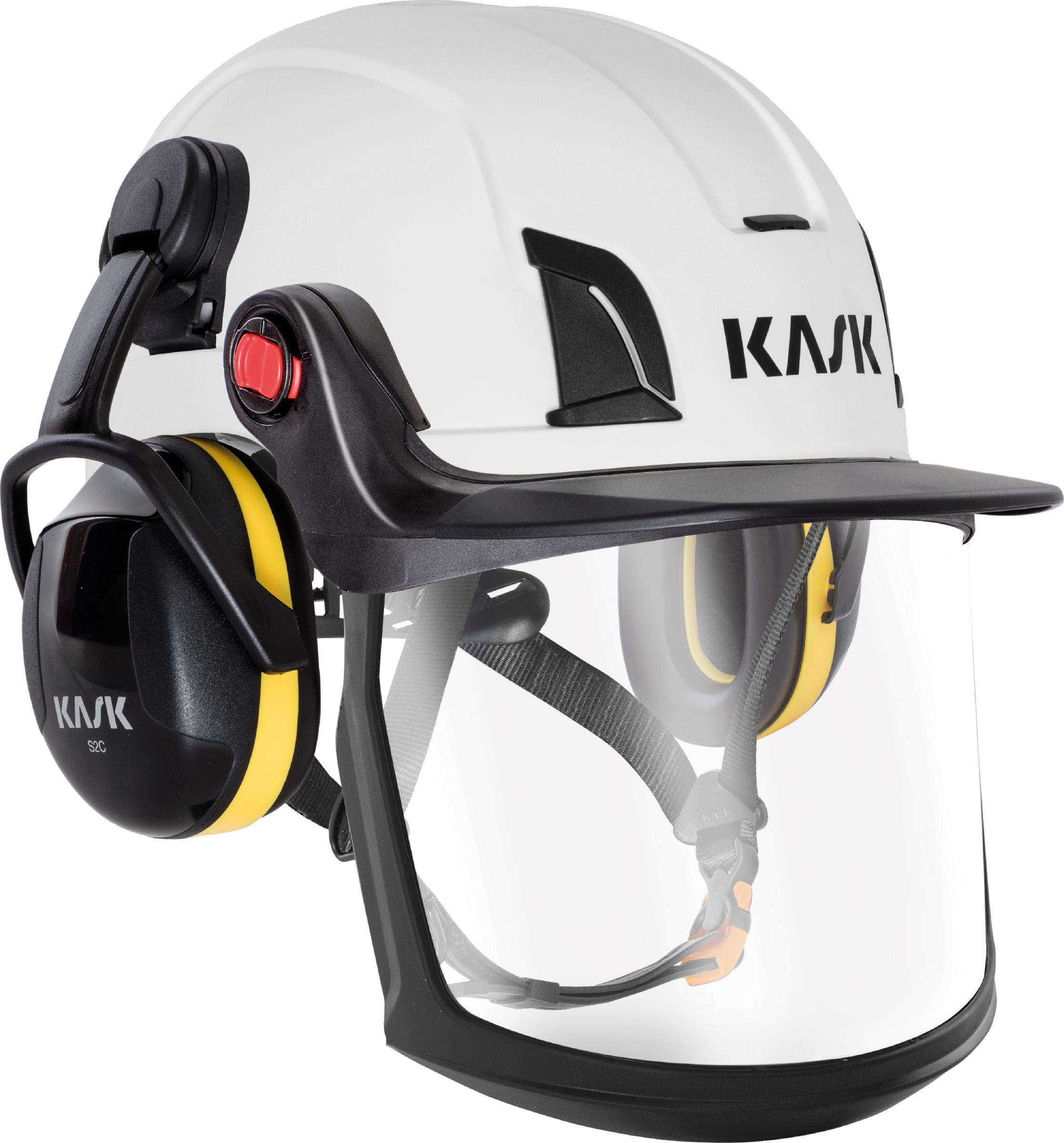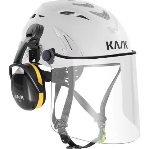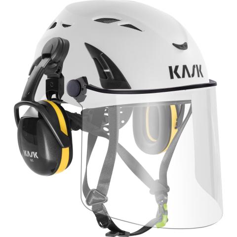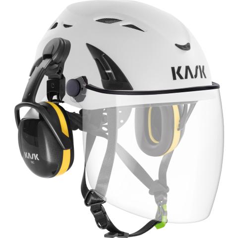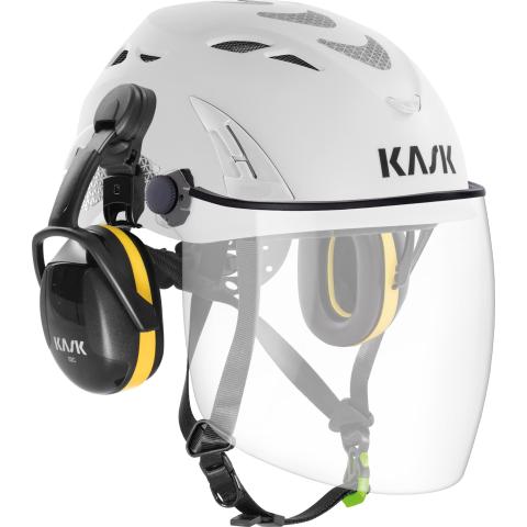 Kypäräkiinnikkeiden alalaidassa on käytävät, joihin saadaan liu’utettua Kask Superplasma Mesh Visor Carrier (WVI00005-) kokokasvosuojainten yläkehyksen varret. Tämä tarjoaa helpon ja kattavan silmien- ja kasvojensuojauksen samalla kun kuulosuojaimet ovat asennettuina.