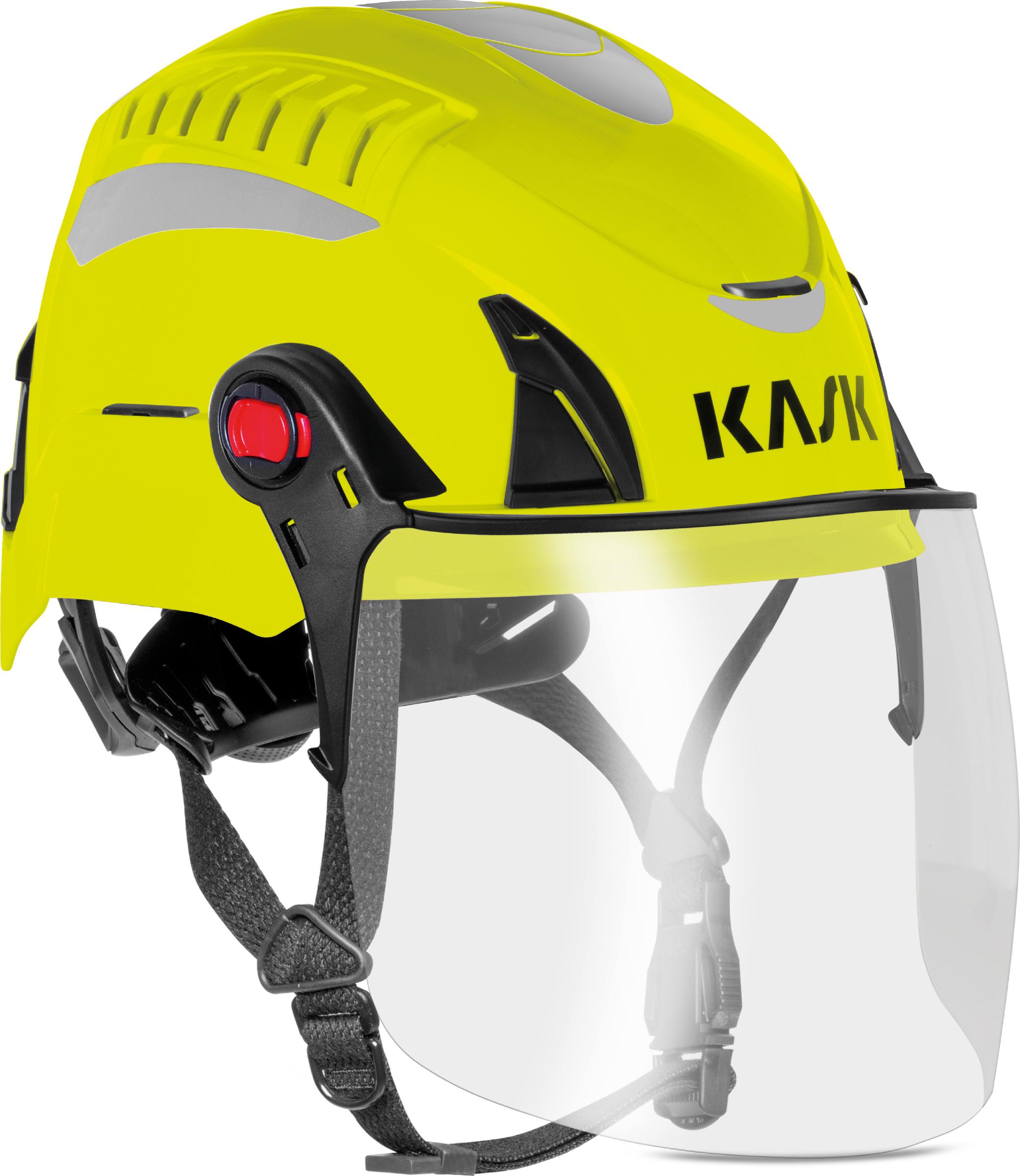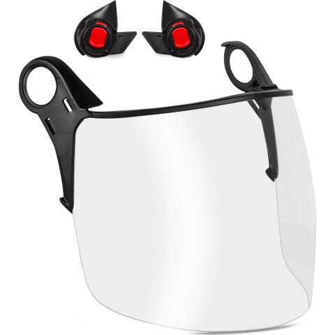 Kirkas palosertifioitu kokokasvosuojain ja palosuojatut Kask EasyClick Adapter FR työkypärädapterit (WAC00074-) yhdistelmäpakkauksena. Täyttää Kask Quantum pelastuskypärän kanssa käytettäessä maastopalostandardin (EN 16471) sekä teknisen pelastustyön standardin (EN 16473) vaatimukset, eli suojaa tilanteissa missä on liekkikosketuksen riski. Voidaan käyttää myös omien silmälasien päällä.