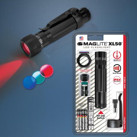Maglite LED XL50 Tactical Combo Pack sisältää valaisimen, MOLLE-yhteensopivan lasikuituvahvisteisen taskuklipsin, kiinnitysavaimen klipsille, 3xAAA laadukkaat alkaliparistot, vierimisenesto/linssinpidikeholkin sekä värilinssit: punainen, sininen ja vihreä.