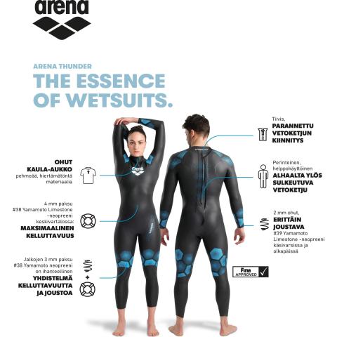 Thunder märkäpuku tuo mukavuutta avovesiuintiin sekä helpottaa oikean uima-asennon ylläpitoa. Thunder märkäpuvussa on optimaalinen yhdistelmä joustavuutta, eristävyyttä ja erityisesti kelluttavuutta aloittelevan avovesiuimarin tarpeisiin. Märkäpuku yhdistää huippuluokan materiaalit ja uniikin kuosin, tuntuu miellyttävältä päällä, istuu hyvin sekä antaa optimaalisen tuen.