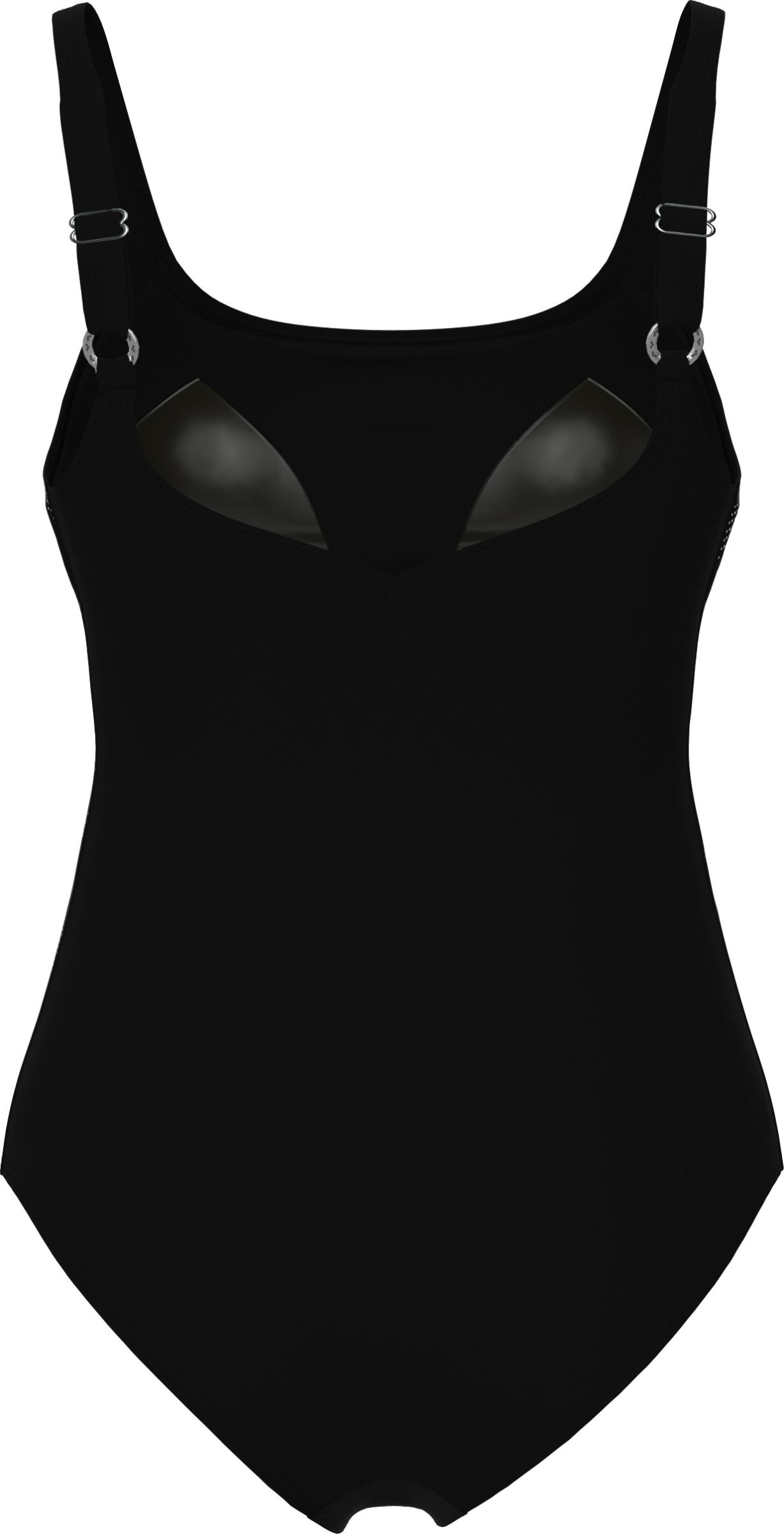 Uimapuvussa on kaksinkertainen kangas sekä kevyesti vatsaa litistävä verkkorakenne. Pehmeä liiviosa, tilavammat kiinteät kupit sekä leveä kuminauha rintojen alla kohottavat ja tukevat povea. Uimapuvun leveät, säädettävät olkaimet sekä umpinainen, hieman uurrettu selkäosa parantavat puvun istuvuutta.