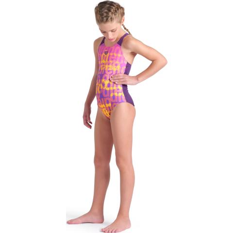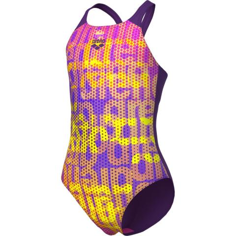 Tyttöjen värikäs Performance-sarjan uimapuku. Leveät ja tukevat olkaimet. V-selkäosa. Vuorikangas edessä*