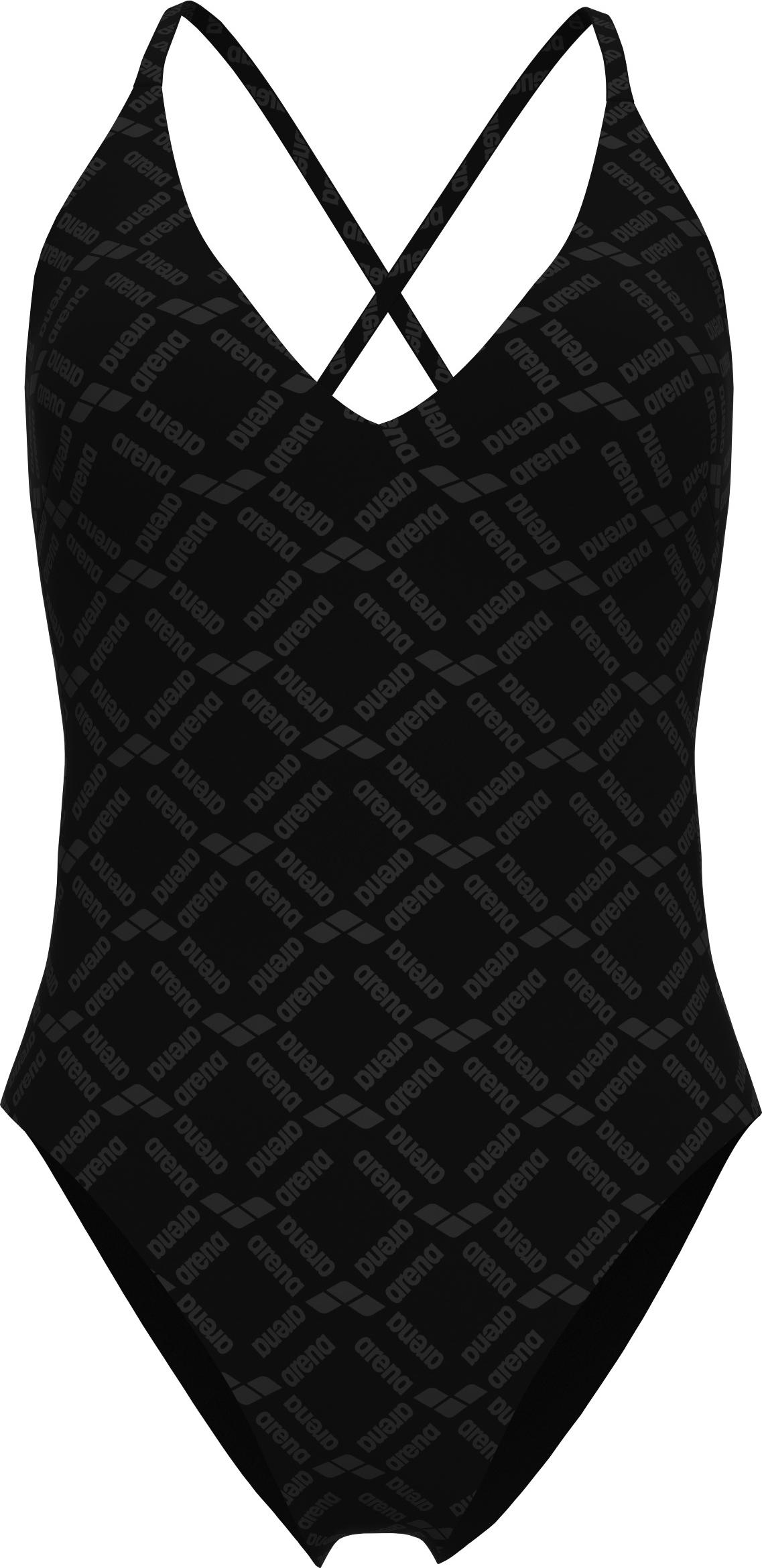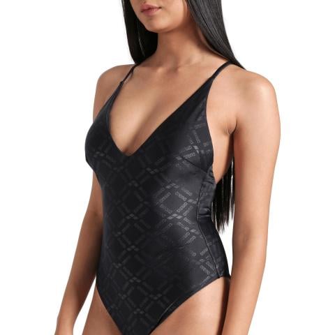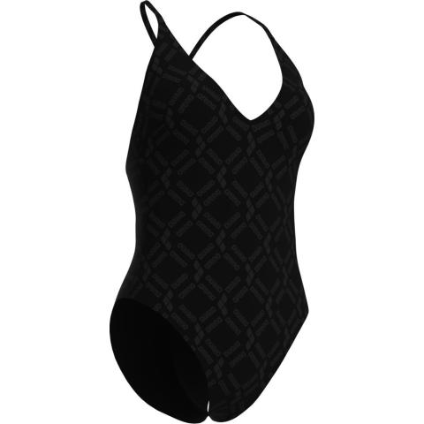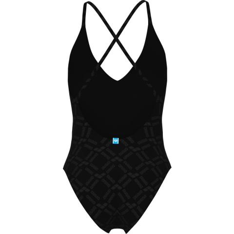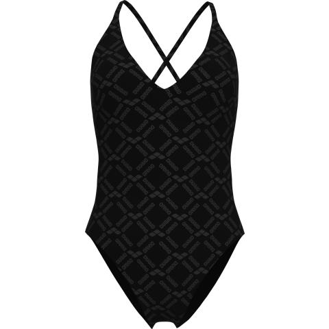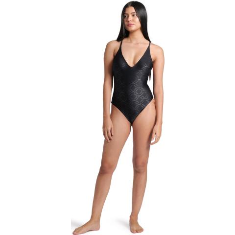 Uimapuvussa on tyylikäs V-mallinen kaula-aukko sekä kevyesti topatut, irrotettavat kupit. Kuminauha rintojen alla antaa kevyen tuen. Puvussa on avoin, syvään uurrettu selkäosa sekä sirot, ristikkäiset olkaimet. Puku on kokonaan vuorattu.