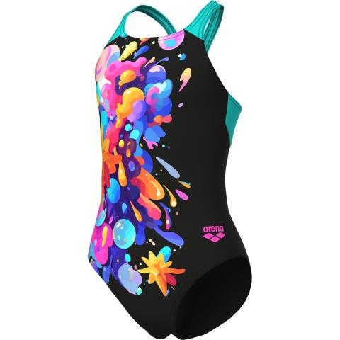 Painting V Back tyttöjen uimapuku MaxFit Eco -kankaalla. Puvussa on ergonominen sekä leveät ja tukevat olkaimet ja värikäs printti edessä.