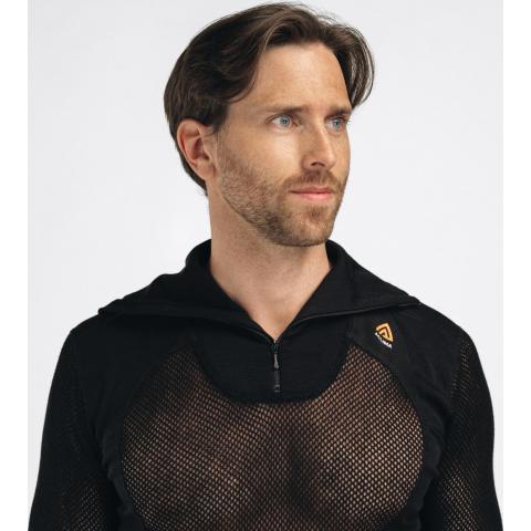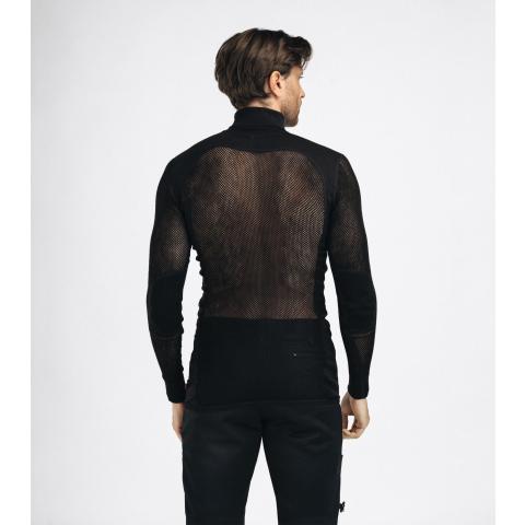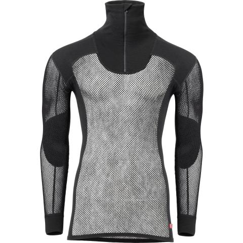 Miesten ainutlaatuinen, pitkähihainen, verkkoaluspaita poolokauluksella ja vetoketjulla. Lämpötilan hallinnan ja mukavuuden kannalta luonnonkuitujen yhdistäminen tekokuituihin on ylivoimaisen hyvä ratkaisu. Woolnet-rakenne, jossa käytetään pehmeää merinovillaa, on aina sopivan lämpöinen ja erittäin hyvin hengittävä. Kuitu imee jopa 30% kosteutta itseensä, ennen kuin se alkaa tuntua märältä. Hartiat ja kyynärpäät on erikseen vahvistettu. Total Easy Care-käsittelyn ansiosta Woolnet ei kutita, ja kutistuu erittäin vähän.