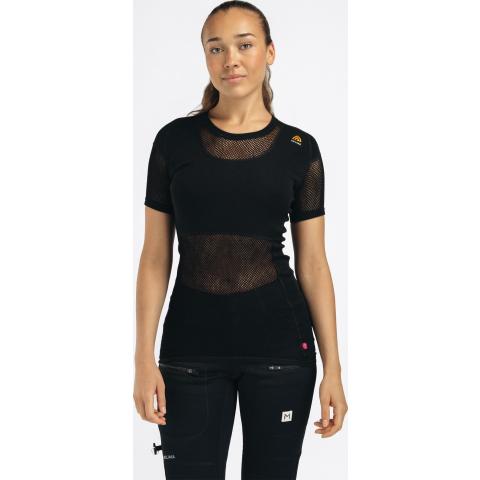 Naisten ainutlaatuinen lyhythihainen verkkoaluspaita. Lämpötilan hallinnan ja mukavuuden kannalta luonnonkuitujen yhdistäminen tekokuituihin on ylivoimaisen hyvä ratkaisu. WoolNet-rakenne, jossa käytetään pehmeää merinovillaa, on aina sopivan lämpöinen ja erittäin hyvin hengittävä. Kuitu imee jopa 30 % kosteutta itseensä, ennen kuin se alkaa tuntua märältä.