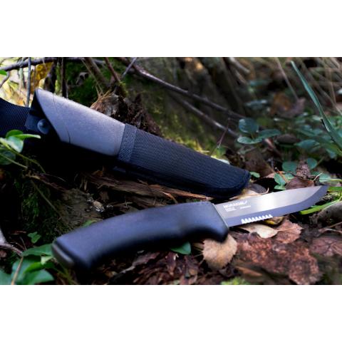 Uusi sotilas- ja viranomaiskäyttöön suunniteltu jämerä sileä/sahalaitateräinen puukko MOLLE kotelolla. Katkaisee hihnat, verkot ja köydet nopeasti. Musta korroosionestopinnoitettu, poikkeuksellisen paksu (3,2mm) ja kestävä terä. Terän hamarapuoli erikoishiottu toimimaan parhaalla mahdollisella tavalla tulustikkujen kanssa. Tyypillisiä käyttäjäryhmiä: poliisi, rajavartiolaitos, tulli ja sotilaat erikoisjoukkoineen.