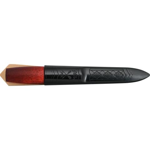Klassinen puukahvainen erittäin terävä yleispuukko keskilyhyellä terällä. Luotettava työkalu, joka soveltuu monipuoliseen yleiskäyttöön: kotiin, mökille, harrastajille ja ammattilaisille. Ergonominen kahva okran punertavaksi petsattua koivua. Tämä kahva tunnetaan siitä, että sen kanssa on miellyttävää tehdä töitä ja se tarjoaa juuri oikean fiiliksen: kahva mahdollistaa voiman käytön, tarkkuuden ja puukon täsmällisen käytön, mikä jatkuvassa käytössä ehkäisee työperäisiä rasitusvammoja.