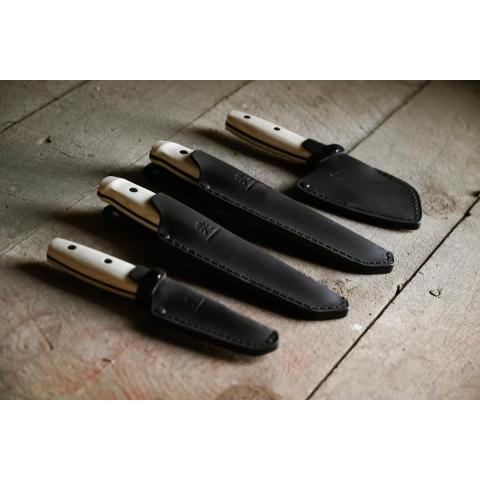 Toimitetaan piikkiin ripustettavassa kierrätetystä materiaalista valmistetussa retail -lahjapakkauksessa, jonka mitat: 28 cm x 7 cm x 4,9 cm. Pakkaukseen kuuluu: Puukko ja nahkatuppi.