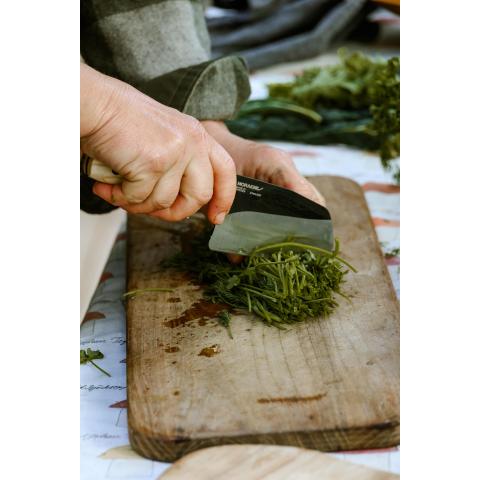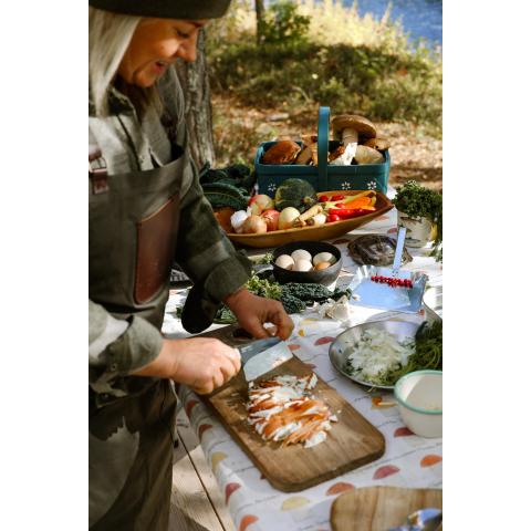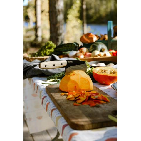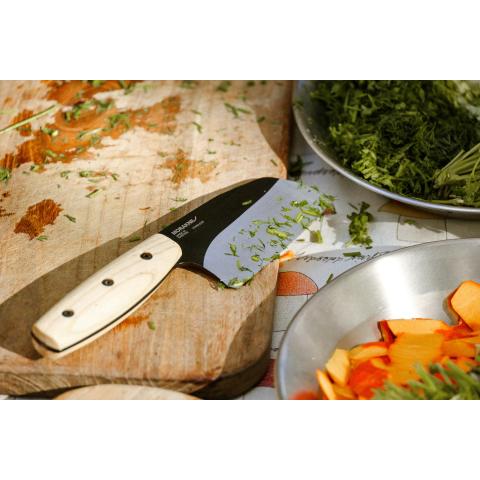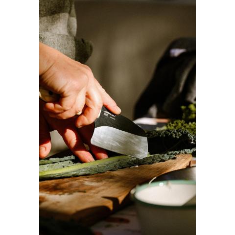 Käsityönä valmistettu ohutteräinen full tang veitsi, joka on suunniteltu ihanteelliseen ruuanlaittoon ulkoilmaolosuhteissa. Kompakti ja monipuolinen malli, joka on suunniteltu kulkemaan helposti mukana taskussa tai repussa. Varuste, joka mahdollistaa kokkaustaitojen kehittämisen uudelle tasolle. Toimitetaan kasvivärjätyn nahkasuojuksen kanssa, joka suojaa veitsen terää huolellisesti.