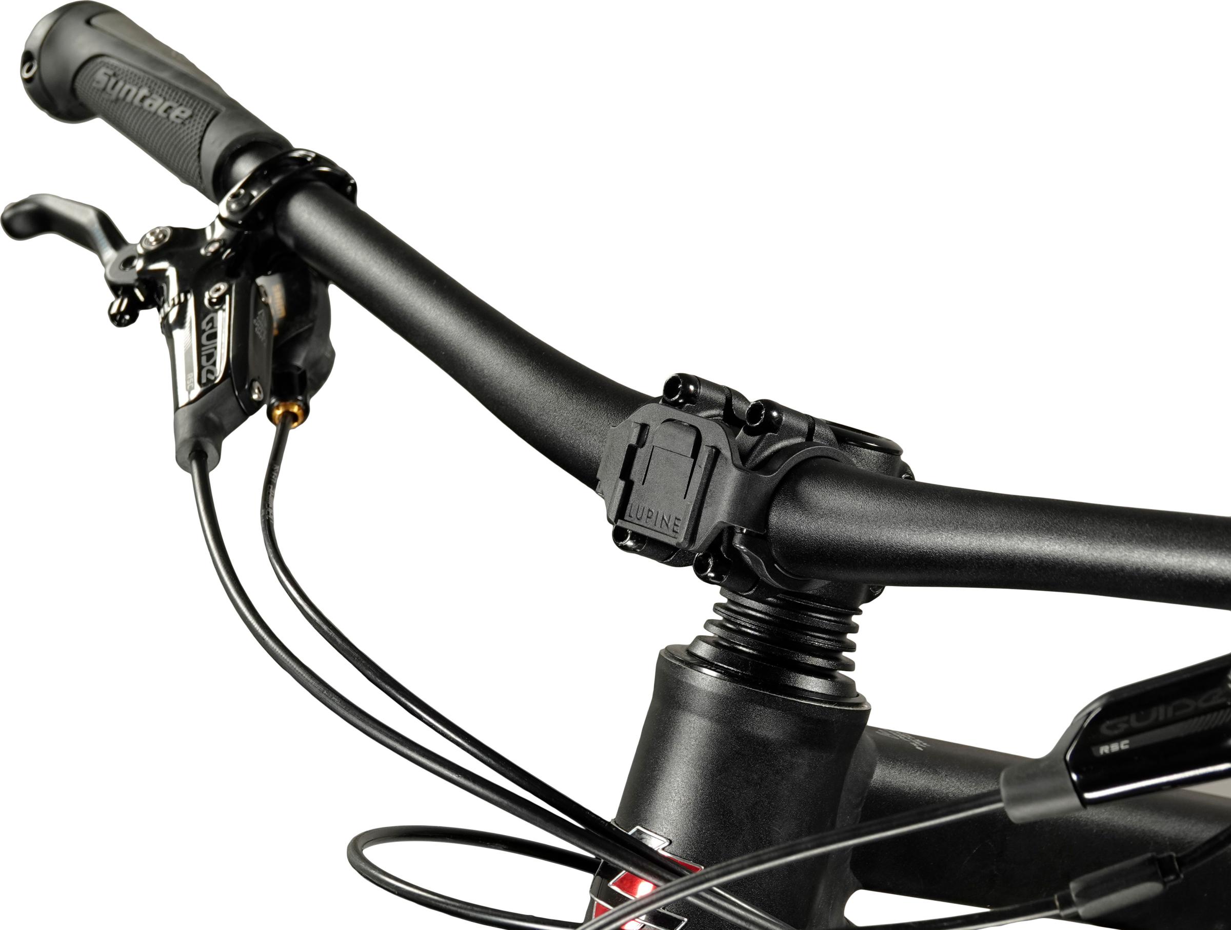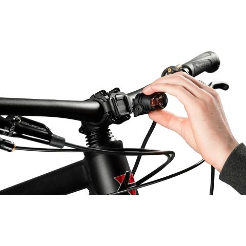 Kiiinnike, jolla Lupine Frontclick valaisimen (Esim PentaPro, Neo, Piko, Blika) valaisimen rungon saa kiinni polkupyörän ohjaustankoon. Ei vaadi paljon tilaa ohjaustangosta. Kiinnike on valmistettu muovista ja ruuvit ruostumattomasta teräksestä.