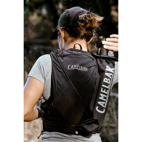 Liivi on suunniteltu ultrakevyeksi ja mallin istuvuus on huippuluokkaa, jolloin se pysyy paikallaan vauhdikkaammassakin kisassa. Etupuolella on kaksi joustavaa taskua CamelBak Quick Stow 0,5L pulloille (sis.), jolloin juoksijalla on mahdollisuus varata toinen pullo vaikka urheilujuomalle ja toinen vedelle.