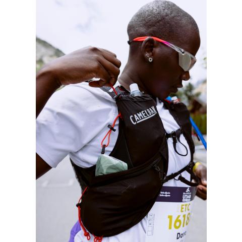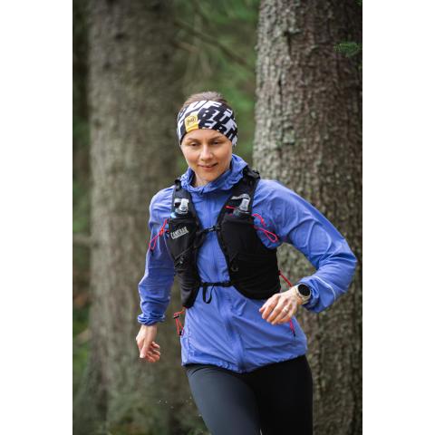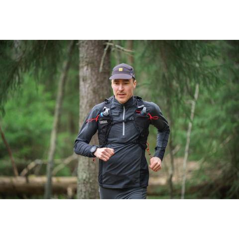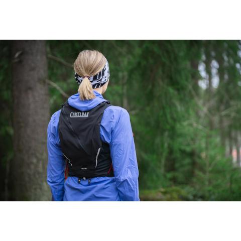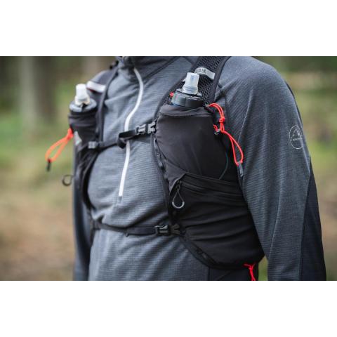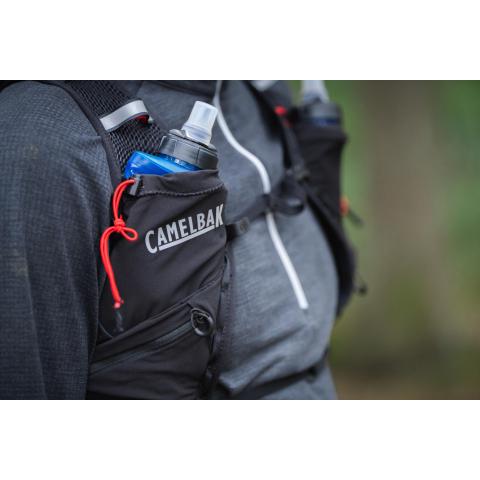 Liivi on suunniteltu ultrakevyeksi ja mallin istuvuus on huippuluokkaa, jolloin se pysyy paikallaan vauhdikkaammassakin kisassa. Etupuolella on kaksi joustavaa taskua CamelBak Quick Stow 0,5L pulloille (sis.), jolloin juoksijalla on mahdollisuus varata toinen pullo vaikka urheilujuomalle ja toinen vedelle.