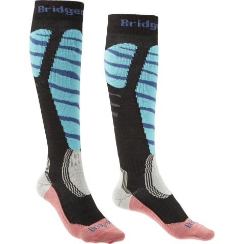 Pitkävartinen sukka lasketteluun aktiiviharrastanaiselle. Muotoutuu todella hyvin jalkaan ja siirtää kosteuden tehokkaasti pois iholta. Varpaissa paksumpaa neulosta lämpimyyden säilyttämiseksi. Muu neulos ohuempaa. Nilkassa ja kantapäässä olevat neulokset helpottavat monoon jalkaan laittamista. Tukevat kiristykset nilkan ja jalkapöydän ympäri pitävät sukan paremmin paikoillaan. Pohkeessa lisäjoustoa antavaa neulosta. Sukan suulla leveä kaksinkertainen resori.