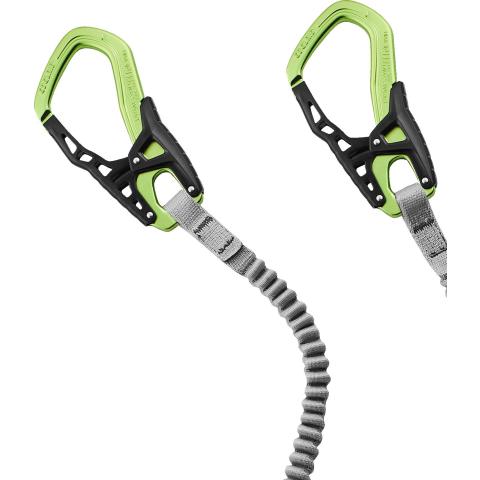 Erittäin kompakti muotoilu. Kulutusta erinomaisesti kestävät liitoshihnat ovat joustavia, jotta ne pysyvät pois tieltä, ehkäisevät takertumista, helpottavat käsittelyä ja tekevät valjaissa kuljettamisesta miellyttävää. Lisäksi niiden ansiosta kiinnittimet ovat aina riittävän lähellä käyttäjää. Poikkeuksellisen kompakti nykäyksenvaimennin mahdollistaa miellyttävän käsittelyn vaikeimmissakin reitin kohdissa.