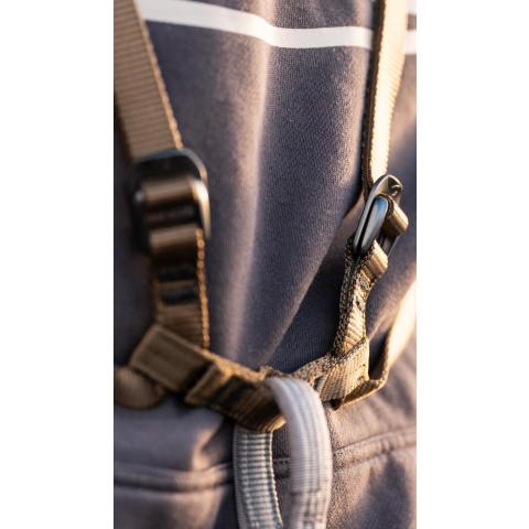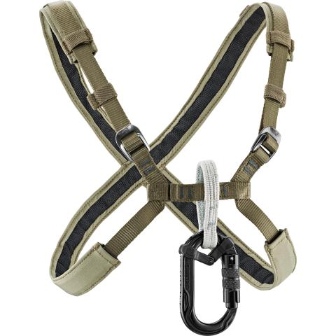 - Valmistettu ohuesta 15 mm hihnasta. Kiinnityslenkki, jossa on Dyneema-ydin ja polyamidipäällyste; erottuu kontrastin ansiosta valjaiden pääväristä