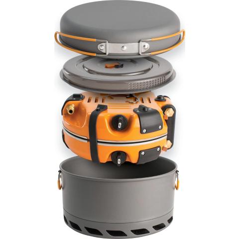 All-in-one keitinjärjestelmä. Pieneen kantolaukkuun pakattu kahden polttimen keitin. Toimii normaalilla retkikeittimen kaasulla. Reilun kokoinen kattila ja paistinpannu. Sytytys helposti piezolla. Genesis vie luonnossa keittämisen kokonaan uudelle tasolle.