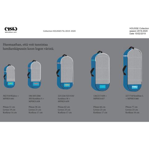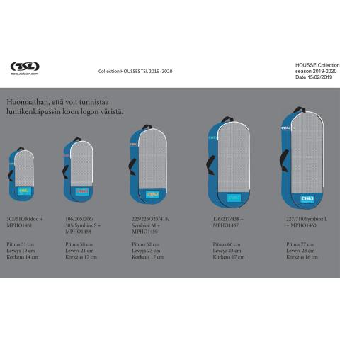 Suojapussi lumikengille. Käy mm. TSL225/226/325/418/Symbioz M + lumikengille. Pituus 62 cm, Leveys 23 cm, Korkeus 17 cm.