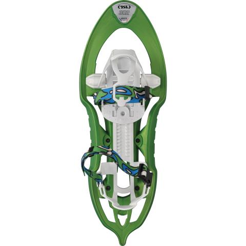Lasten lumikenkä, jonka side on suunniteltu aktiiviseen käyttöön. 3D-tiimalasimuodon ansiosta kengät kantavat hyvin lumessa. Edessä oleva muovihammastus ja pohjassa olevat kuusi teräspiikkiä lisäävät pitoa jäällä.