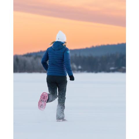 Näillä kengillä jäisellä ja lumisella alustalla liikkuminen on helppoa. Käveleminen sujuu kuin talvikengillä, mutta kantava pinta-ala on kaksinkertainen ja pito jäällä erinomainen.
