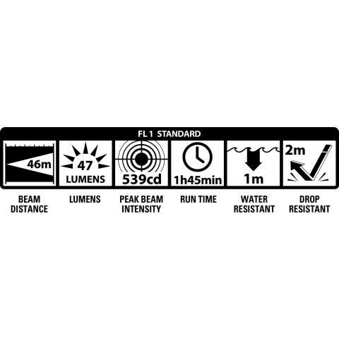Suorituskyky ANSI FL1 standardin mukaisesti: Valon kantama 47 m, valon voimakkuus 552 candelaa, valovirta 47 lumenia. Paloaika 1 h 45 min. Vesitiivis IPX7 -1 m. Iskunkestävä 2 m. Ei polttimonvaihtotarvetta.