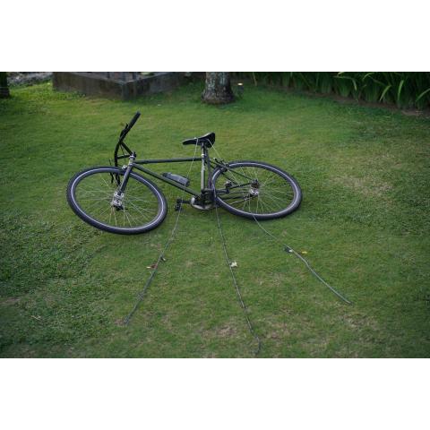 Kiilojen kiinnittäminen maahan ja sen jälkeen köyden kiinnittäminen pyörään/sauvoihin on todella nopeaa. Toimii myös heikompien puiden, kävelysauvojen tai jopa moottoripyörän kanssa.
