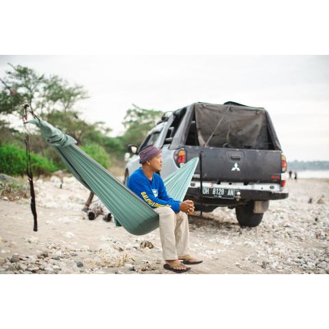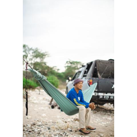 Materiaali on korkealaatuista hengittävää laskuvarjonailonia, joka kunnioittaa kehon verenkiertoa eikä synnytä painepisteitä tarjoten näin mitä mukavimmat unet ja fiiliksen. Kestää kosteutta, kuivaa nopeasti ja karkottaa ikävän. Koukut päissä ruostumatonta terästä. Paino vain 500 g. Kesto 200 kg. Pituus 3,20 m koukusta koukkuun. Makuupituus 2,90 m, leveys 1,55 m. Kuljetuspussin pituus 37 cm, halkaisija 10 cm. Konepestävissä 30C. Kahden vuoden materiaali- ja valmistusvirhetakuu. Valmistettu eettisissä ja ihmisoikeutta kunnioittavissa olosuhteissa Balilla.