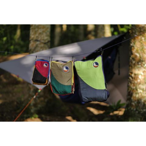 Pakkauskuution kulmissa on pienet lenkit, joihin saa mukana tulevan karabiinin kiinnitettyä ja joilla kuutio on kätevä kiinnittää melkein mihin vain. Kuutiot voi pakata myös sisäkkäin.