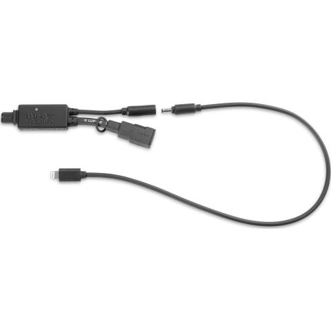 Applen iPhone-puhelimiin sopiva adapteri, jolla saa virtaa ulos samalla kun käyttää Lupine-valaisinta. Mainio tarvike esimerkiksi polkupyörässä, jolloin voi ladata kännykkää ajaessa.