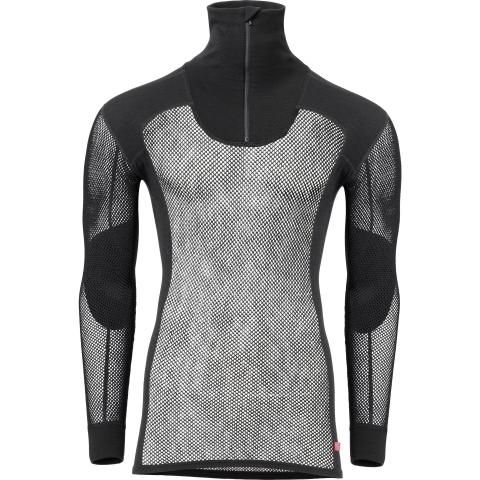 Miesten ainutlaatuinen, pitkähihainen, verkkoaluspaita poolokauluksella ja vetoketjulla. Lämpötilan hallinnan ja mukavuuden kannalta luonnonkuitujen yhdistäminen tekokuituihin on ylivoimaisen hyvä ratkaisu. Woolnet-rakenne, jossa käytetään pehmeää merinovillaa, on aina sopivan lämpöinen ja erittäin hyvin hengittävä. Kuitu imee jopa 30% kosteutta itseensä, ennen kuin se alkaa tuntua märältä. Hartiat ja kyynärpäät on erikseen vahvistettu. Total Easy Care-käsittelyn ansiosta Woolnet ei kutita, ja kutistuu erittäin vähän.