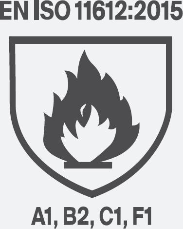 > EN ISO 11612/15 (suojavaatetus kuumuudelta ja liekiltä) luokka A1 (rajoitettu liekkikosketus), B2 (konvektiokuumuus), C1 (säteilylämpö), F1 (kosketuslämpö)