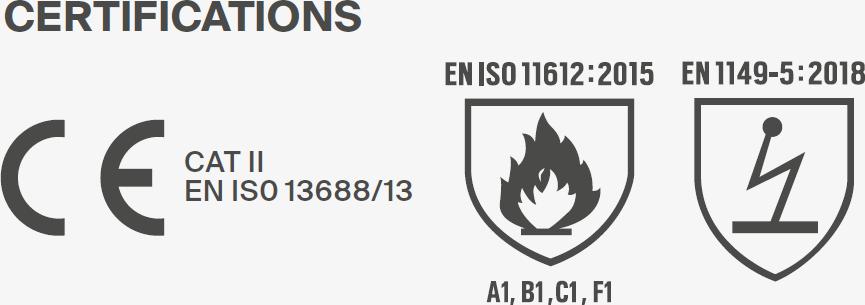 - Täyttää CE EN ISO 13688/13, EN ISO 11612/15 luokka A1, B1, C1, F1 ja EN 1149-5/08 standardien vaatimukset