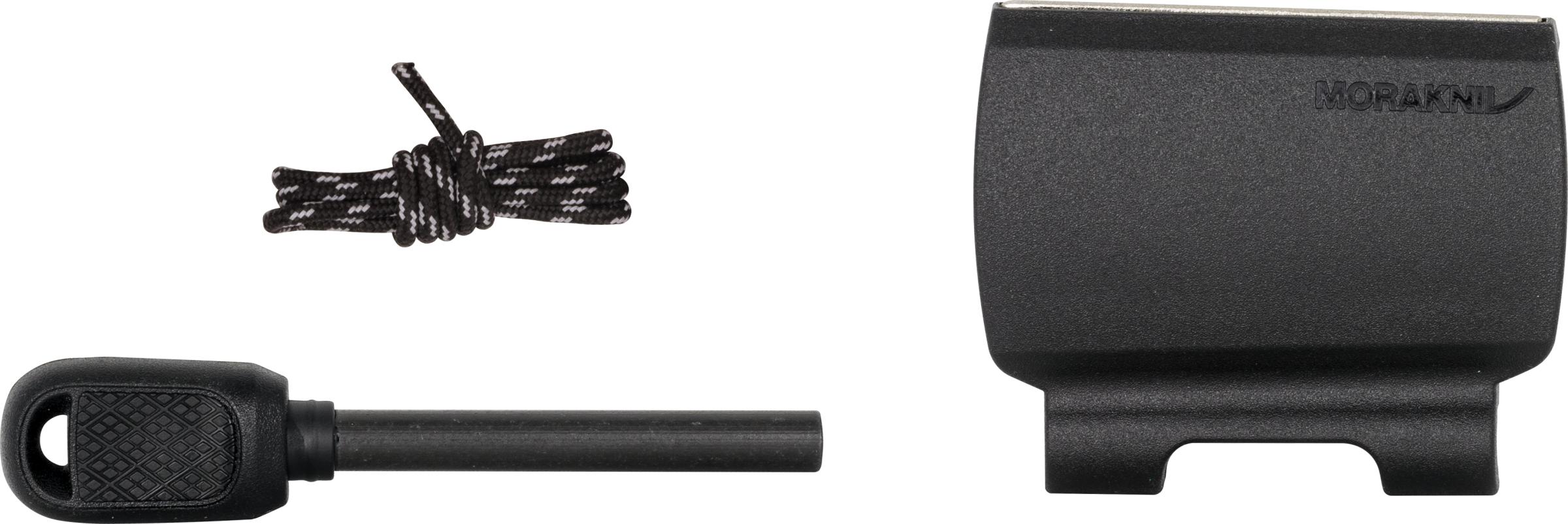 Selviytymispakkaus Morakniv Kansbol ja Garberg puukoille. Pidike kiinnitetään puukon muovituppiin ja siinä on magnesiumtulustikku ja täyspituinen timanttiteroitin. Helppo kiinnittää ja irrottaa tupesta vain napsauttamalla.