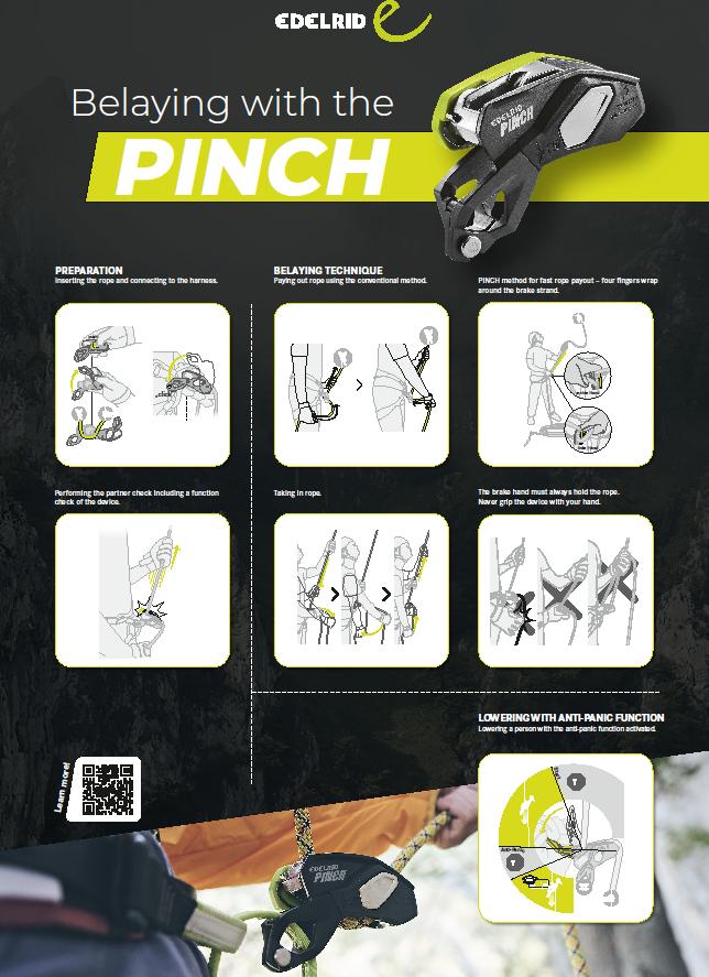 Vaihtaminen oikean ja vasemman käden välillä on myös nopeaa, sillä laitetta ei tarvitse varmistaa oikealla kädellä. Pinch on ihanteellinen sekä aloittelijalle, satunnaiselle käyttäjälle että kaikkein kokeneimmille kiipeilijöille, jotka hakevat parasta suorituskykyä ja nopeutta.