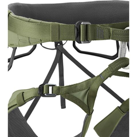 Kolme alumiinista Slide Block -solkea lantiovyössä ja jalkalenkeissä voidaan avata kokonaan, mikä mahdollistaa helpon pukemisen ja yksilöllisen säätämisen. Center Fit -rakenne varmistaa lantiovyön ja värikoodatun etukiinnityspisteen keskiasennon.