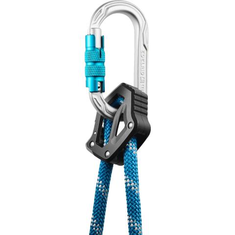 Tarvitset lisäksi lukkosulkurenkaan liitosköyden päähän. Suositeltava malli Edelrid Oval Power Triple Lock.