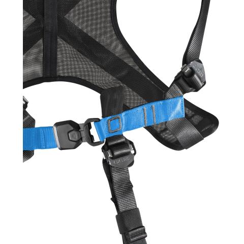 Edessä tekstiilinen putoamisen pysäyttävän järjestelmän kiinnityspiste. Pukemisen kannalta oleelliset alueet erottuvat sinisinä, joka myös nopeuttaa hahmottamista ja pukemista.