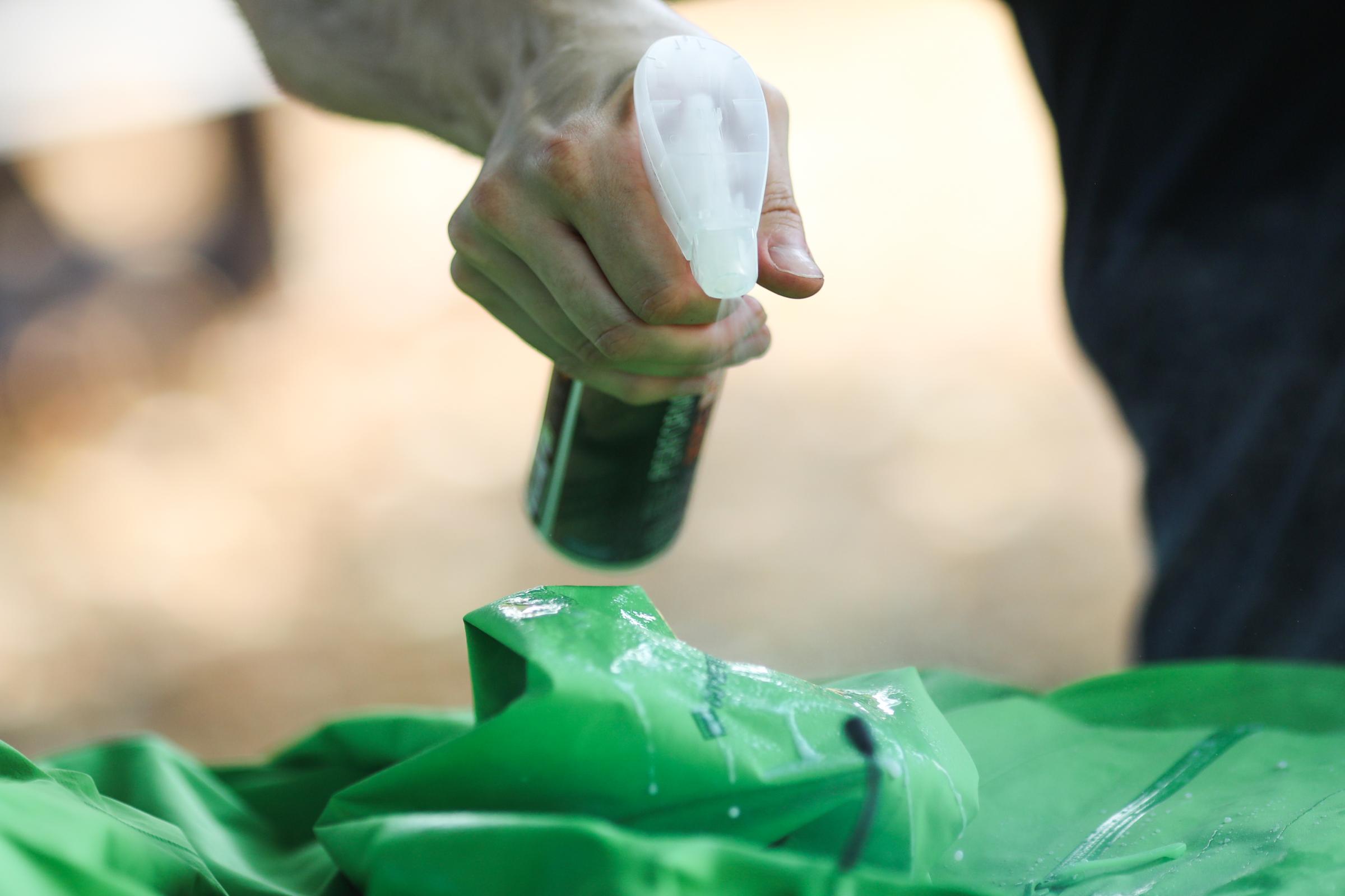 4. Poista ylimääräinen aine kostealla liinalla ja anna kuivua luonnollisesti, tai kuivaa rumpukuivaajassa mikäli varusteen hoito-ohjeet sen sallivat.