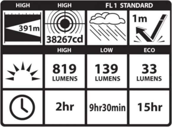 Suorituskyky ANSI FL1 standardin mukaisesti mitattuna. Valovirta max asetuksella 819 lumenia. Valon kantama 391 m. Valon voimakkuus 38 267 Candelaa. Iskunkestävä 1 m. Roiskevesitiivis IPX4.