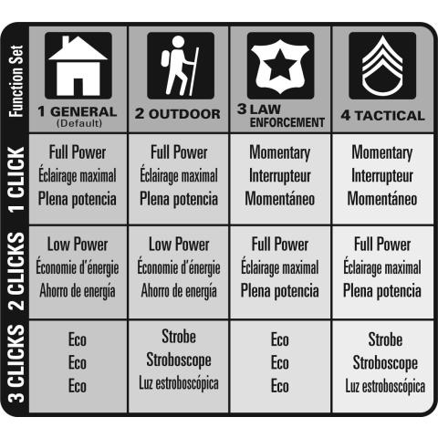 General -yleiskäyttöasento on valaisimessa esiasetettuna, ja sen toiminnot ANSI FL1 standardin mukaisesti: