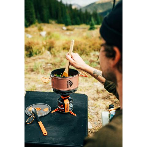 Poltinosa liitetään astian pohjaan ja se toimii tavallisella retkikeittimen kaasusäiliöllä (ei sis.).