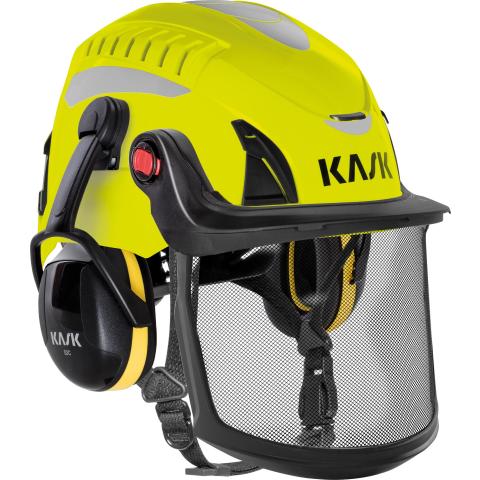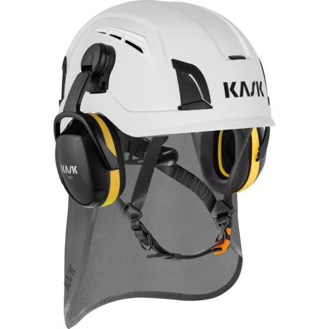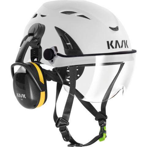 Kypäräkiinnikkeiden alalaidassa on käytävät, joihin saadaan liu’utettua Kask Superplasma Mesh Visor Carrier (WVI00005-) kokokasvosuojainten yläkehyksen varret. Tämä tarjoaa helpon ja kattavan silmien- ja kasvojensuojauksen samalla kun kuulosuojaimet ovat asennettuina.