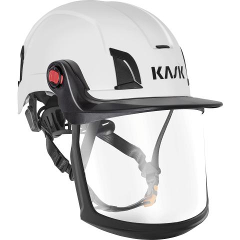 Kaksi asentoa: Nostettuna kypärän päälle kuljetusasentoon sekä laskettuna alas silmien eteen työasentoon. Yläreunassa kumireunus ehkäisee vesipisaroiden valumista kasvoille, ja alareunuksen pyöreä viimeistely tekee käytöstä miellyttävää ja ihoturvallista.